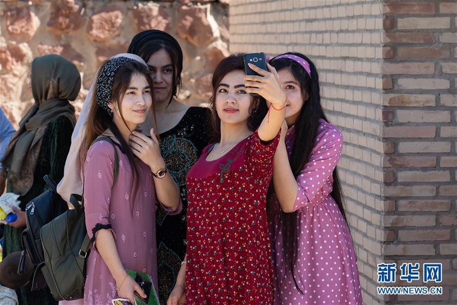 4月14日,在塔吉克斯坦首都杜尚别以西的吉萨尔城堡,几名游客自拍。新华社记者白雪骐摄