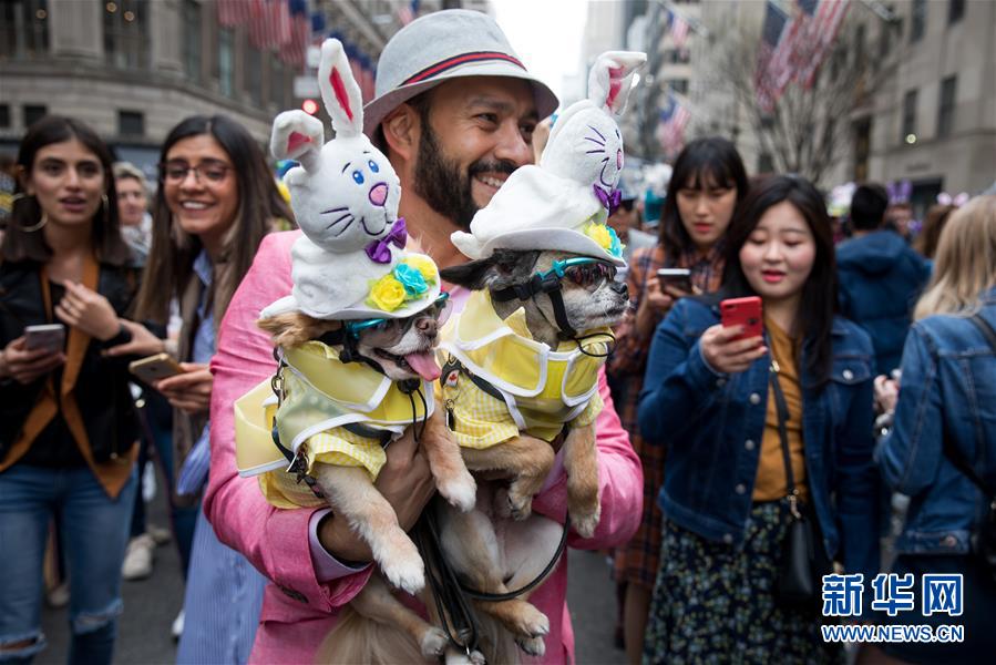 4月21日,在美国纽约,一名男子带着精心装扮的小狗参加复活节花帽游行。当日是西方传统节日复活节,人们穿戴色彩缤纷、创意十足的服饰和花帽,在纽约第五大道参加一年一度的花帽游行。新华社发(郭克摄)