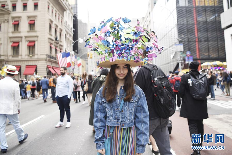 4月21日,在美国纽约,一名女孩参加复活节花帽游行。当日是西方传统节日复活节,人们穿戴色彩缤纷、创意十足的服饰和花帽,在纽约第五大道参加一年一度的花帽游行。新华社记者韩芳摄