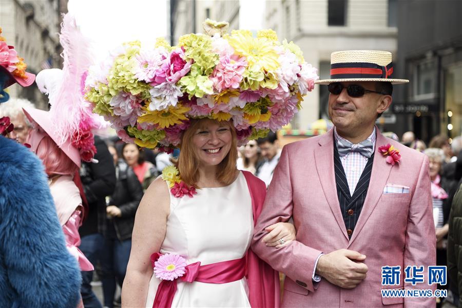 4月21日,在美国纽约,人们盛装参加复活节花帽游行。当日是西方传统节日复活节,人们穿戴色彩缤纷、创意十足的服饰和花帽,在纽约第五大道参加一年一度的花帽游行。新华社记者韩芳摄