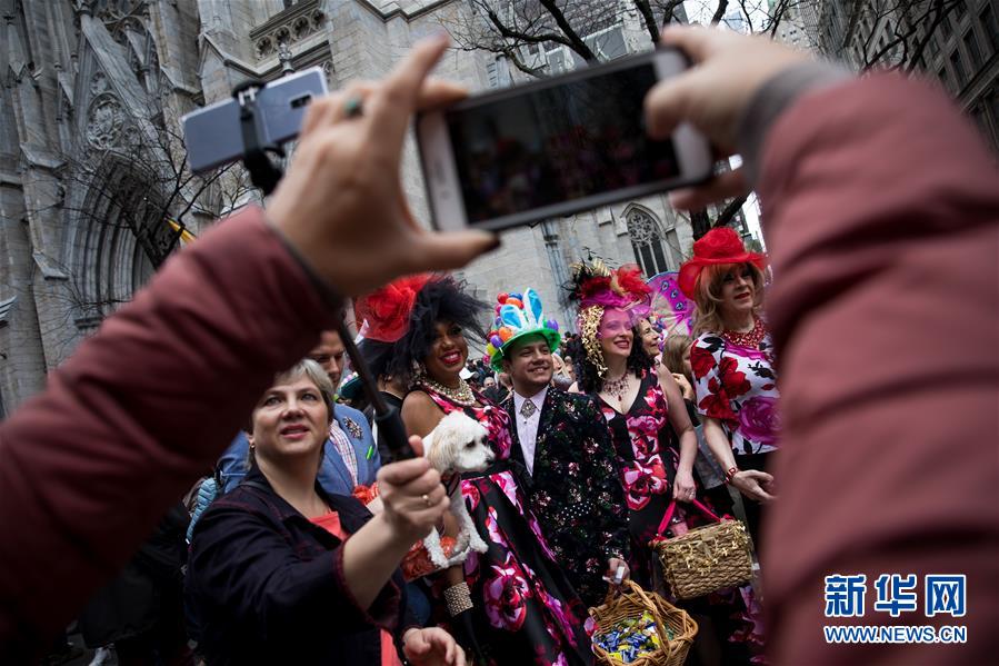 4月21日,在美国纽约,人们盛装参加复活节花帽游行。当日是西方传统节日复活节,人们穿戴色彩缤纷、创意十足的服饰和花帽,在纽约第五大道参加一年一度的花帽游行。新华社发(郭克摄)