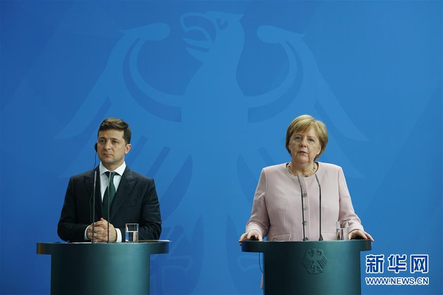 6月18日,在德国柏林,德国总理默克尔(右)与到访的乌克兰总统泽连斯基共同出席联合记者会。德国总理默克尔18日说,德国不会支持欧盟增加对俄罗斯的经济制裁措施。默克尔当天在柏林与乌克兰总统泽连斯基举行会谈。她在会谈后的联合记者会上说,在本周晚些时候举行的欧盟峰会上,德国将支持欧盟延长现有的对俄经济制裁措施,但不支持增加更多制裁。新华社记者王勍摄