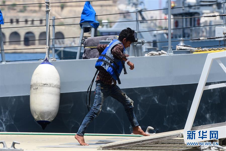 6月23日,在马耳他弗洛里亚纳,一名被营救的偷渡者走下马耳他武装部队的巡逻艇。当日,马耳他武装部队对37名在马耳他海域遇险的偷渡者实施了救援。据报道,这批偷渡者日前乘坐橡皮艇从利比亚出发,22日晚间在马耳他海域遇险。马耳他武装部队的巡逻艇23日采取救援措施,并将偷渡者带至马耳他武装部队位于弗洛里亚纳的码头基地。新华社发(乔纳森·博格摄)