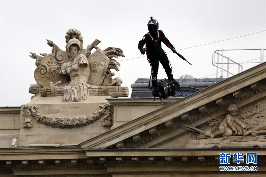 这是7月14日在法国巴黎举行的国庆阅兵仪式上拍摄的操作飞行器的“钢铁侠”。当日,法国在首都巴黎举行国庆阅兵仪式。新华社发(杰克·陈摄)