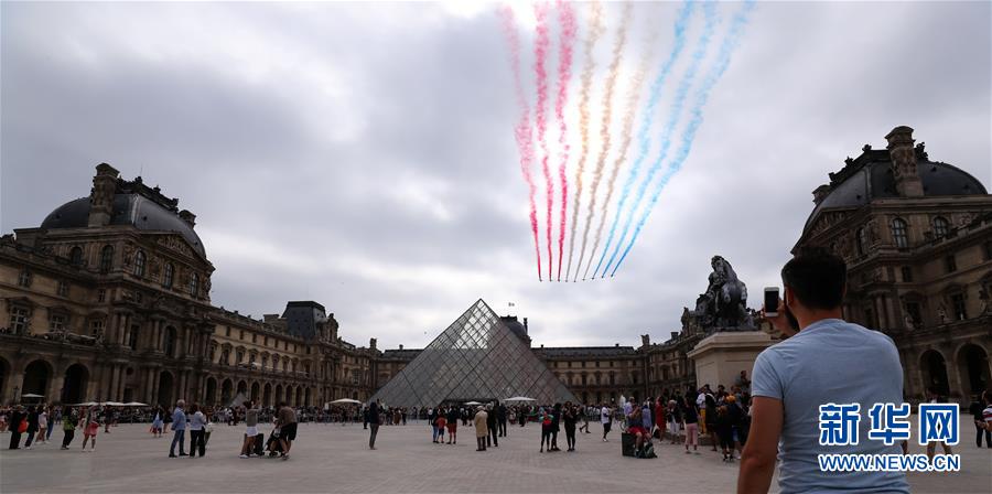7月14日,在法国巴黎举行的国庆阅兵仪式上,“法兰西巡逻兵”飞行表演队飞过卢浮宫金字塔广场上空。当日,法国在首都巴黎举行国庆阅兵仪式。新华社记者高静摄