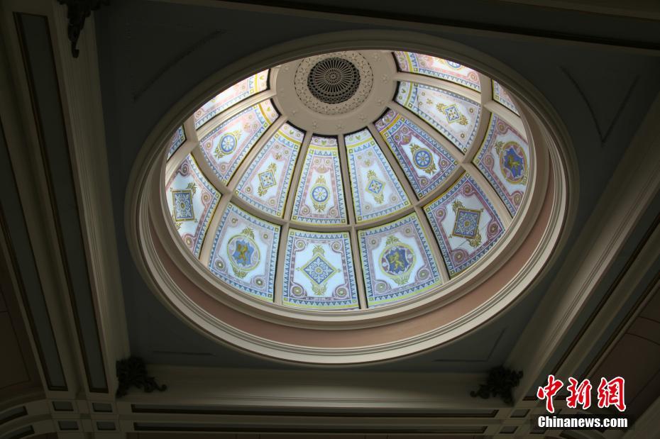 英国英格兰西北部的麦克斯菲尔德(Macclesfield)小镇,历史上丝绸制造业兴旺,曾被誉为英国的“丝绸之都”,为欧洲丝绸产业中心。该镇与中国的交往有400多年的历史,是古代“丝绸之路”在欧洲延伸的最西端。如今,随处可见的“丝绸元素”仍鲜活地呈现于世。图为小镇市政厅用丝绸装饰、风格独特的穹顶。中新社记者张平摄