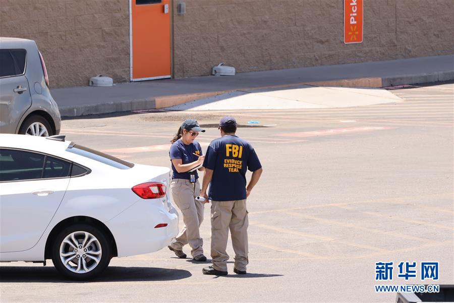 8月4日,在美国得克萨斯州西部埃尔帕索市,美国联邦调查局探员在枪击案现场调查取证。美国得克萨斯州西部埃尔帕索市3日发生一起严重枪击事件,警方证实目前已造成20人死亡、20多人受伤。新华社记者刘立伟摄
