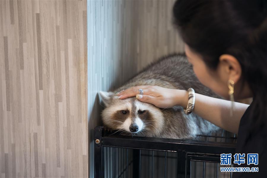 9月9日,一名顾客在曼谷动物咖啡馆和一只浣熊互动。新华社记者张可任摄