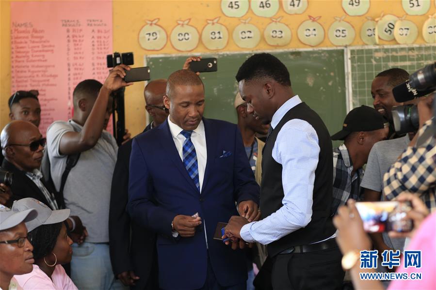 10月23日,博茨瓦纳民主改革联盟总裁杜马·博科(中,蓝色领带)在博茨瓦纳首都哈博罗内参加投票。博茨瓦纳23日举行新一届国民议会选举,将选出57名国民议会议员和490名地方议会议员。新华社发