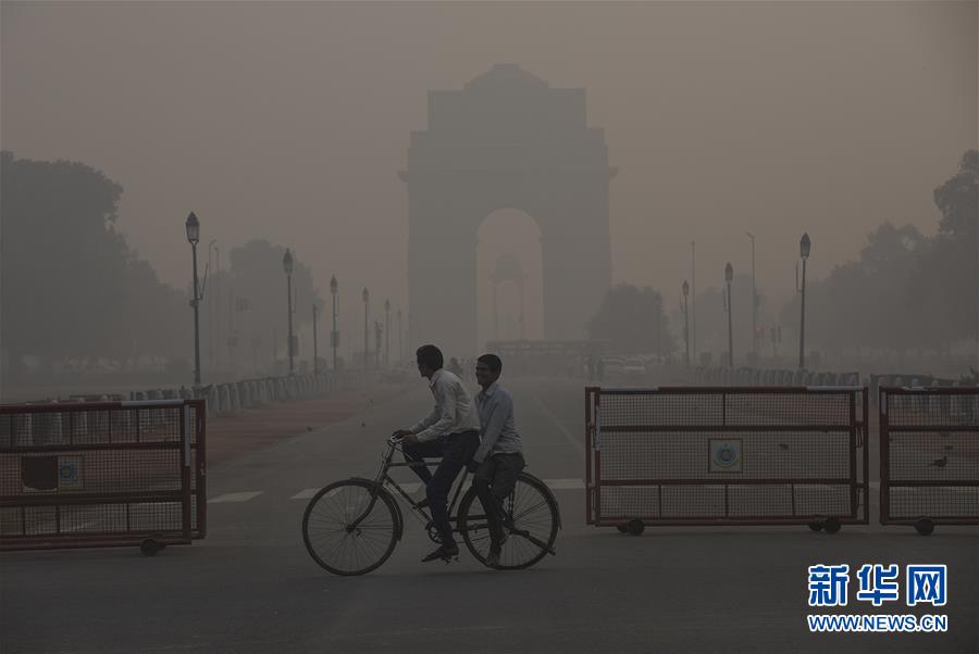 11月13日,在印度新德里,两名男子经过雾霾中的印度门。印度首都新德里近日遭遇严重空气污染,能见度低下,城市被雾霾笼罩。新华社发(贾维德·达尔摄)