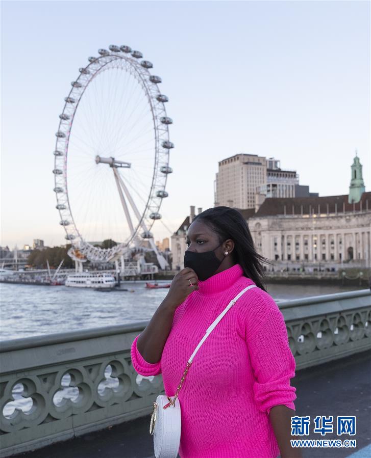 10月31日,一名戴口罩的女子在英国伦敦的“伦敦眼”前行走。新华社记者韩岩摄