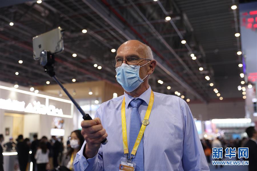 11月7日,罗伊在进博会场馆内自拍留念。新华社记者卢烨摄