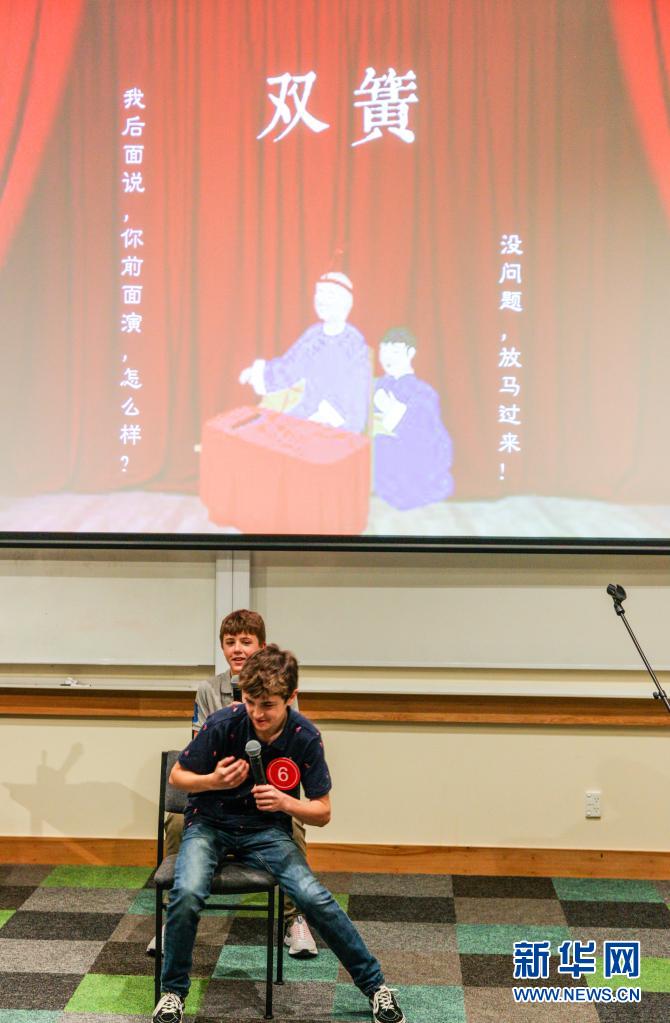 6月13日,在新西兰南岛克赖斯特彻奇举行的“汉语桥”中文比赛新西兰南岛赛区总决赛上,选手们在进行中文双簧表演。