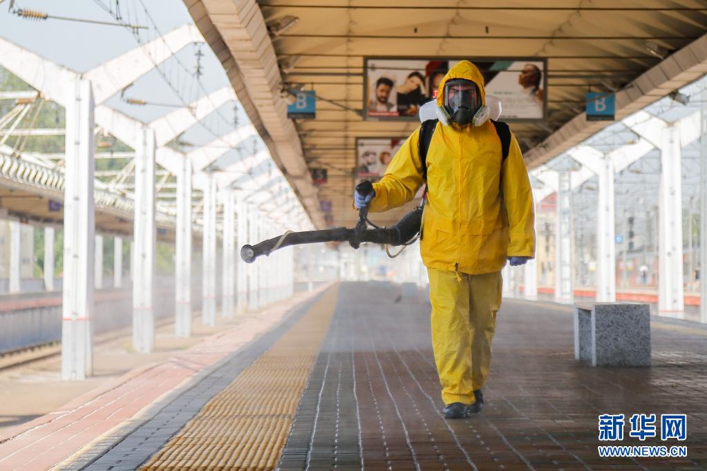 6月24日,工作人员身着防护服在俄罗斯莫斯科一个火车站进行消毒作业。