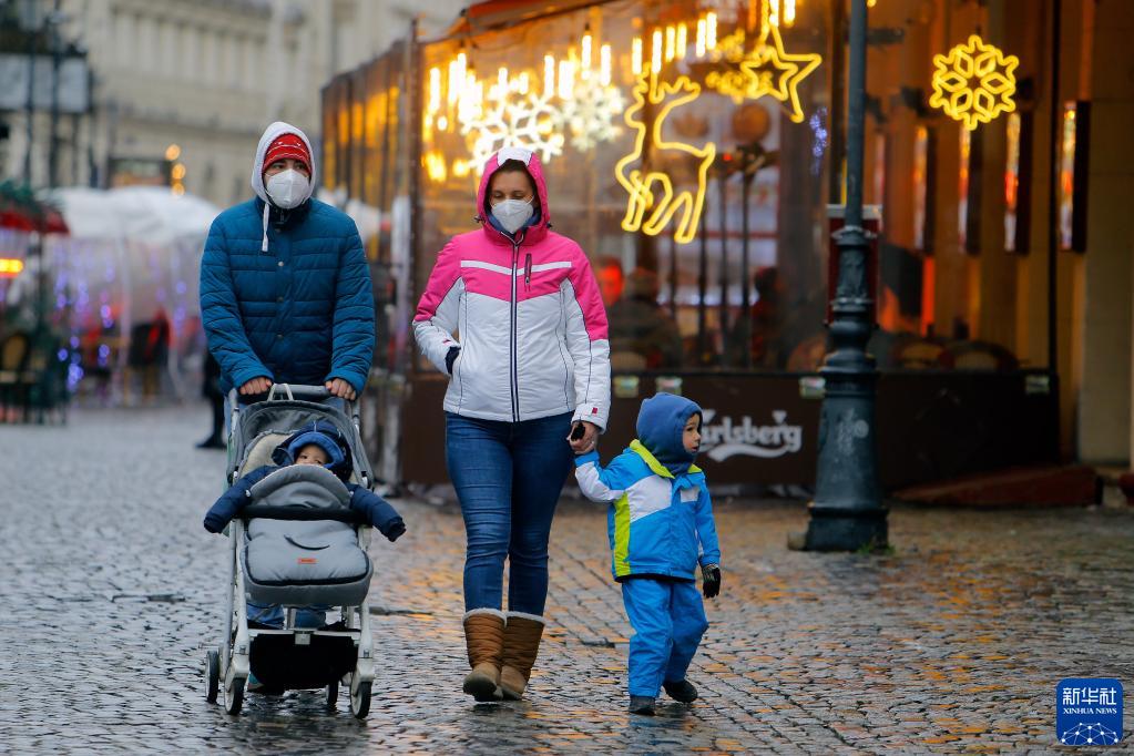1月8日,在罗马尼亚首都布加勒斯特,当地居民戴着口罩在街上散步。