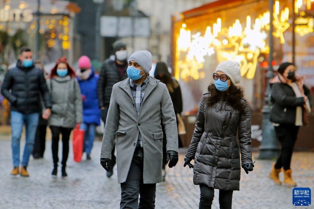 1月8日,在罗马尼亚首都布加勒斯特,当地居民戴着口罩在街上散步。