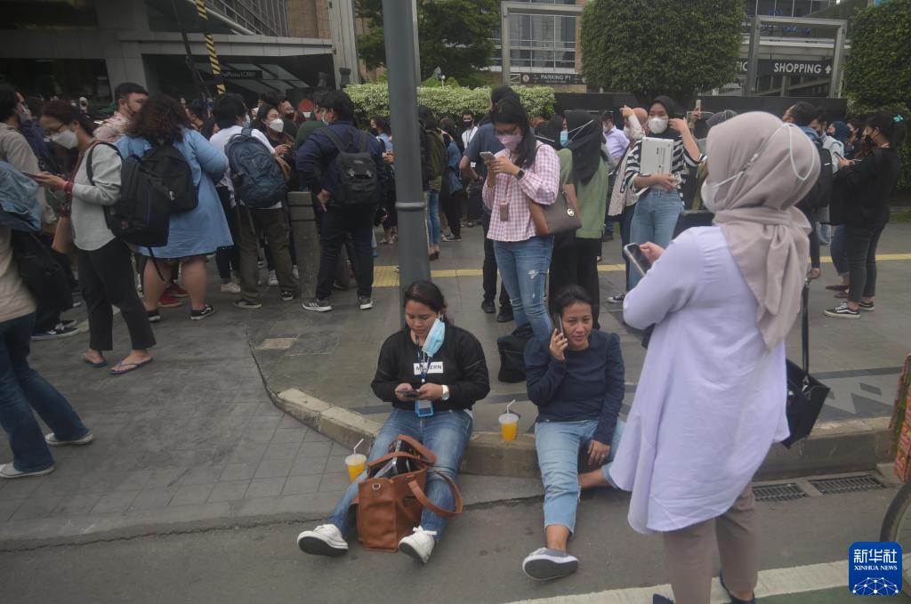 1月14日,在印度尼西亚雅加达,地震发生后人们在室外避险。